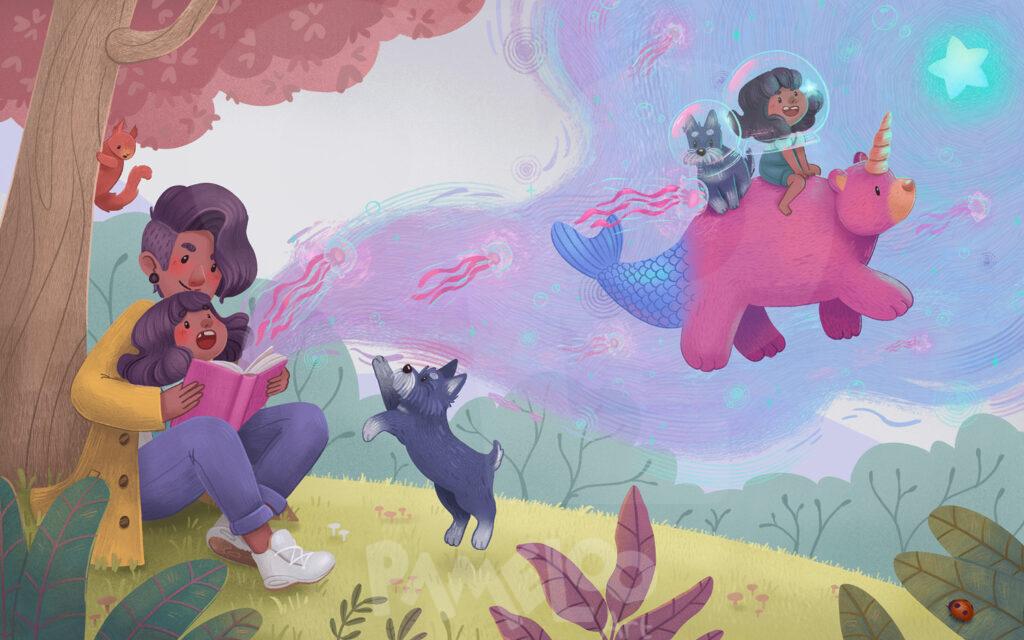 Seated on a fluffy autumnal grass, the mother holds a book featuring a whimsical narrative. As she reads about a bear with a unicorn horn and a mermaid tail soaring through the cosmic expanse, the daughter’s eyes sparkle with fascination. The story unfolds like a magical tapestry, blending elements of land and sea, reality and fantasy.